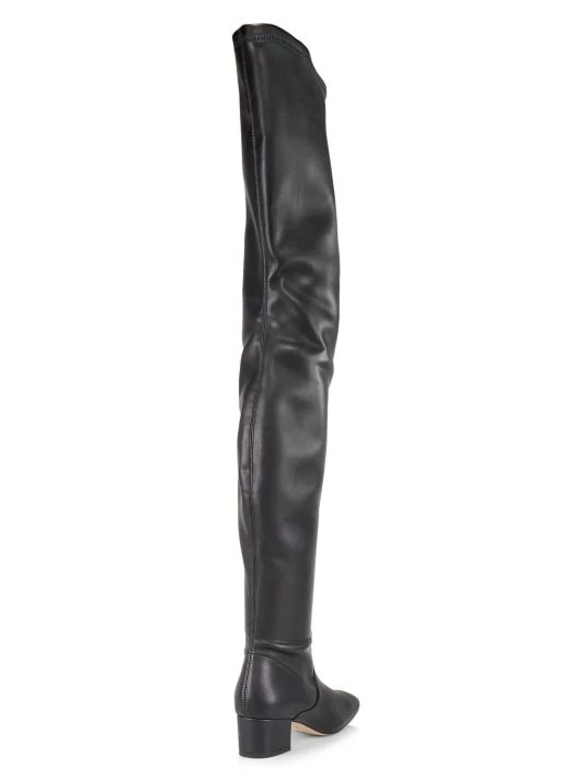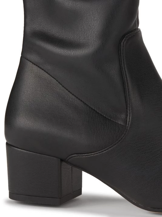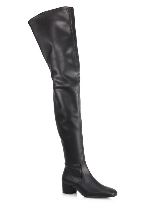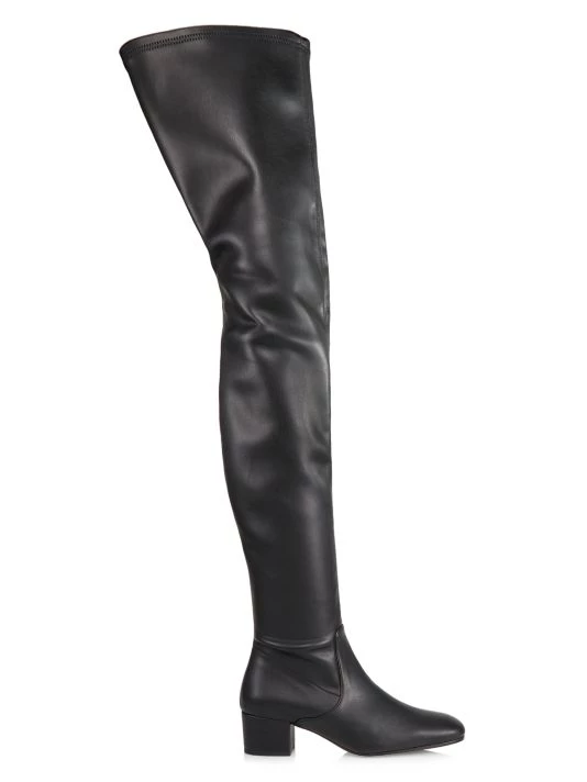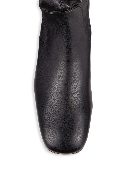 Rendered in smooth imitation leather, these over-the-knee boots flaunt a squared toe and block heel.