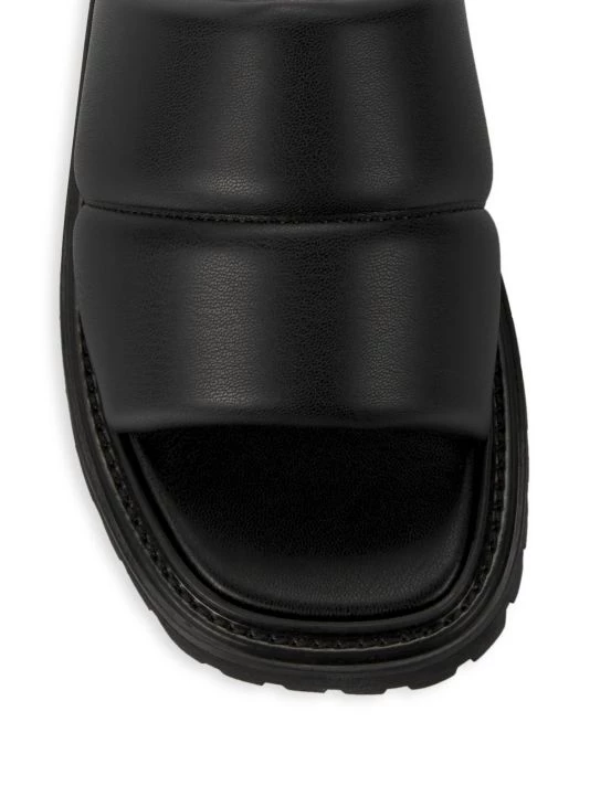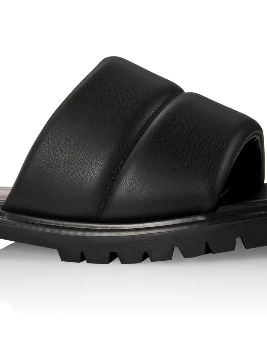 Staud’s Astro slides are crafted of padded vegan leather. These shoes feature an edgy lugged sole with a modern squared toe.