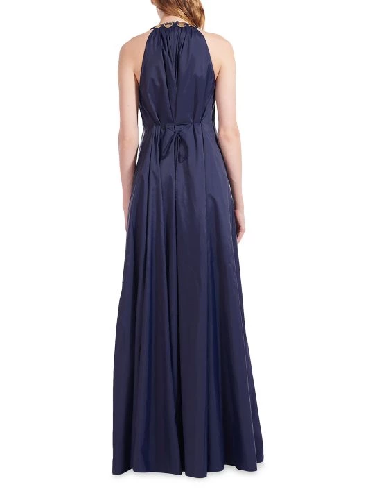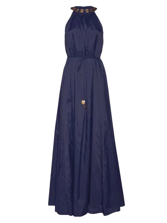 Hammered plates adorn the neckline of STAUD’s Benoit maxi dress. Crafted of technical nylon, this piece is cinched with a dainty removable belt.
