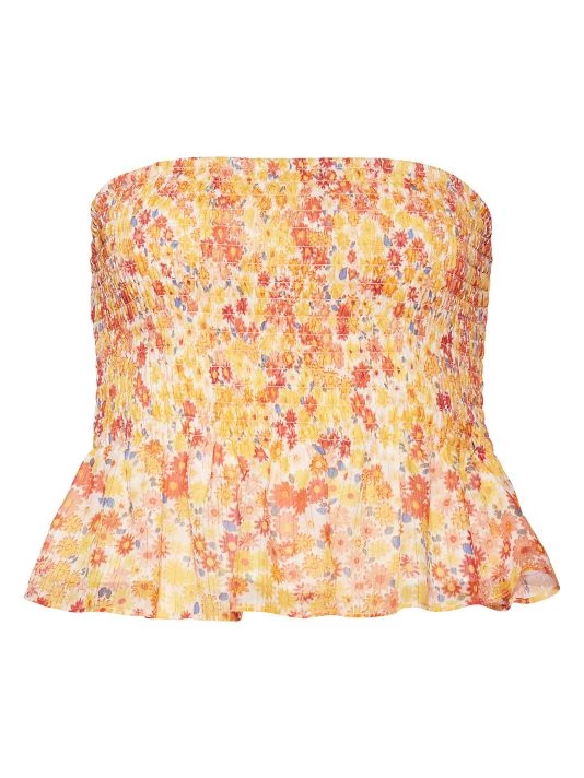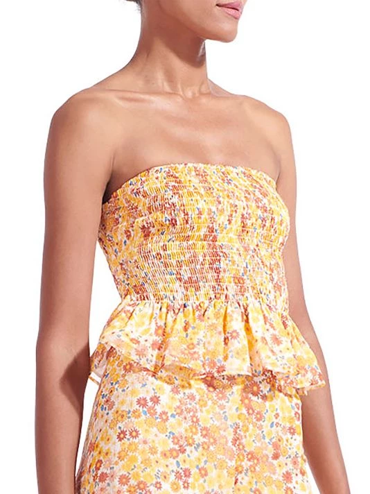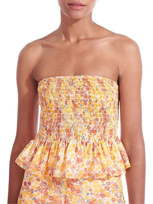 A vibrant floral print animates STAUD’s Bernadette top. Designed with a flattering smocked bodice, this cropped piece is enhanced with a voluminous fluted hem.