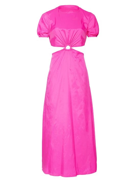 STAUD’s Calypso maxi dress is crafted of recycled nylon and features side inseam pockets, puff sleeves, and a cutout waistband with circular keyhole detail.