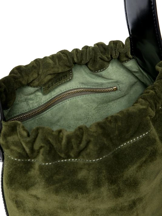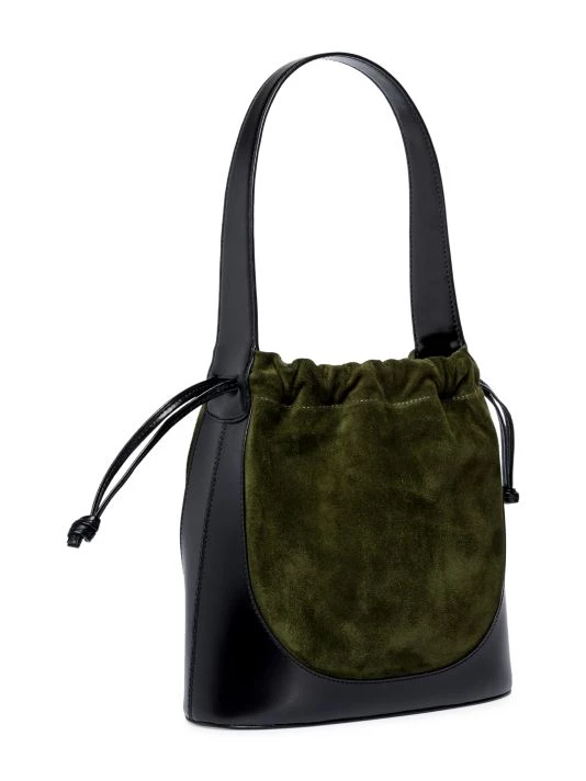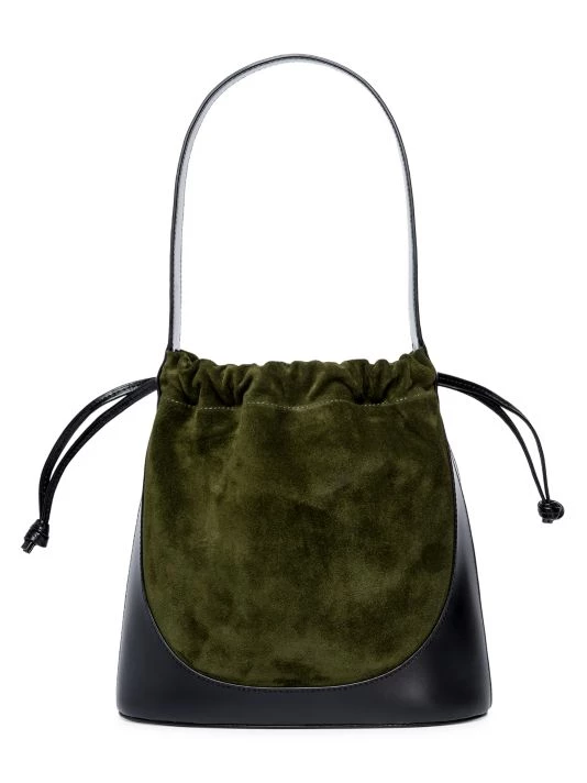 Supple suede framed with smooth leather creates this bucket bag, cinched with a drawstring closure.