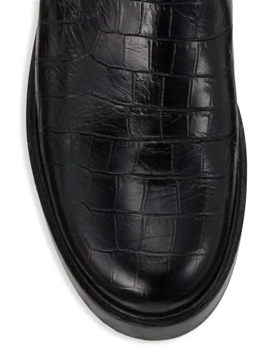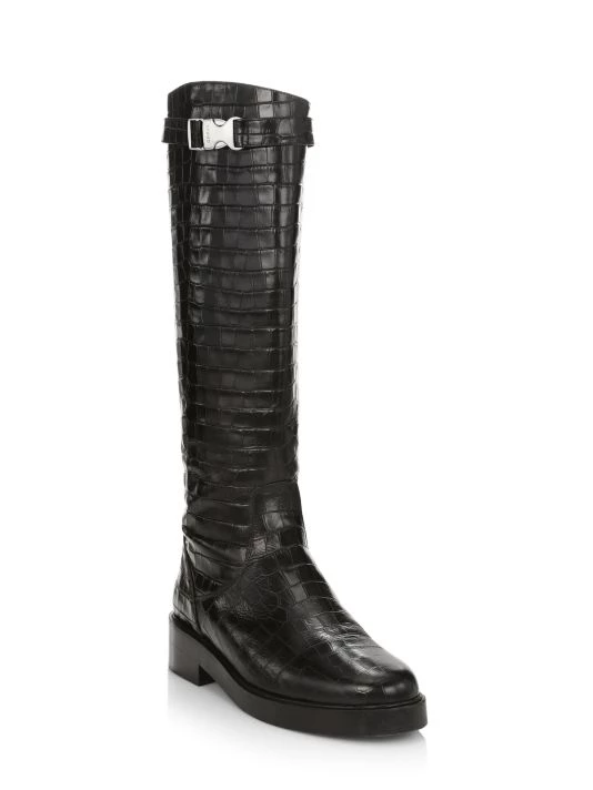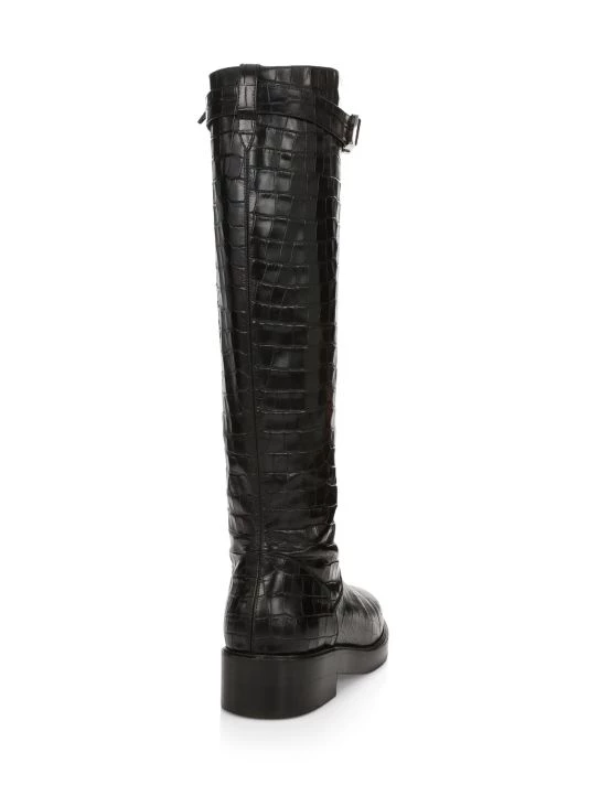 Rendered in crocodile embossed leather, these riding boots feature a buckle strap that wraparound the cuff.