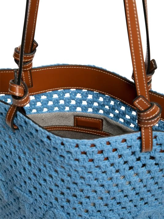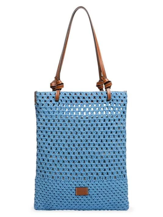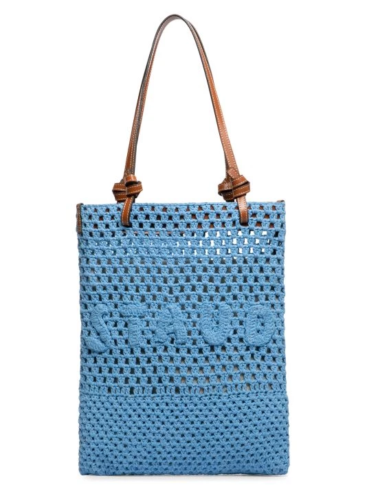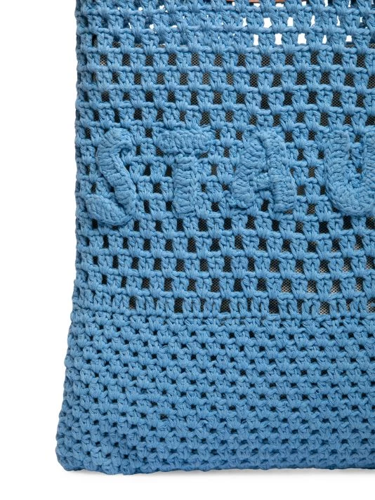 Topped with knotted leather straps, STAUD’s Helm tote is designed in an effortless crochet construction with a bold logo motif.