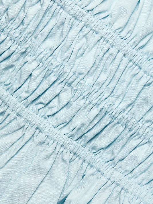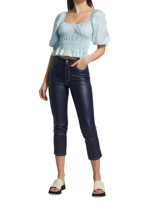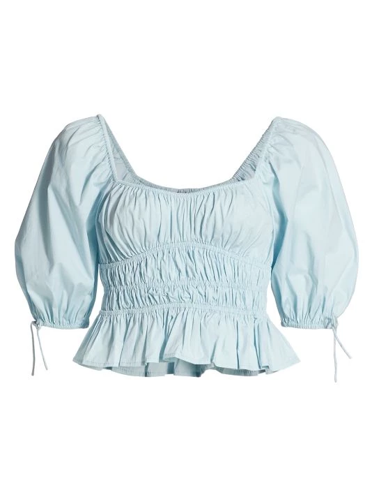 Peasant style top cropped at the waist, featuring whimsical puff-sleeves, ruched body, and flared hem.