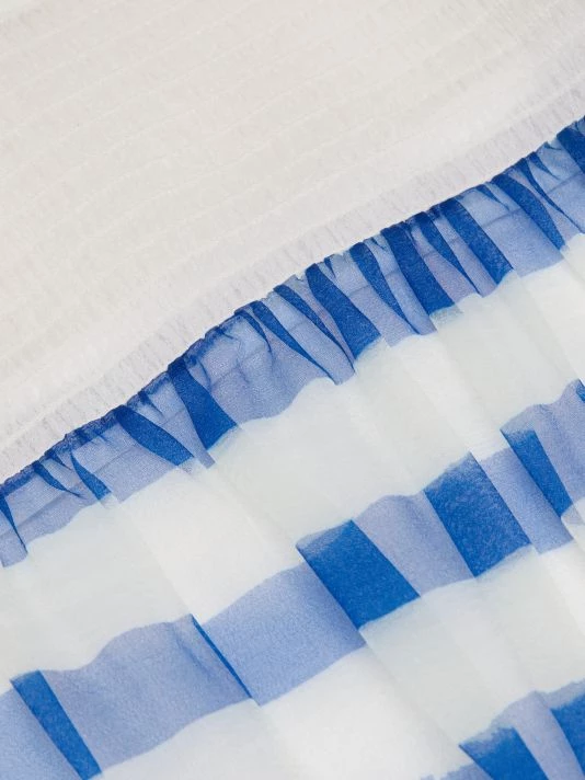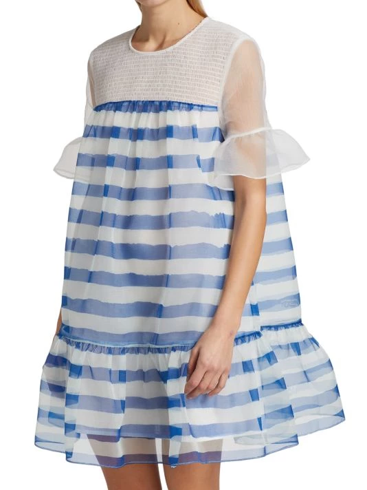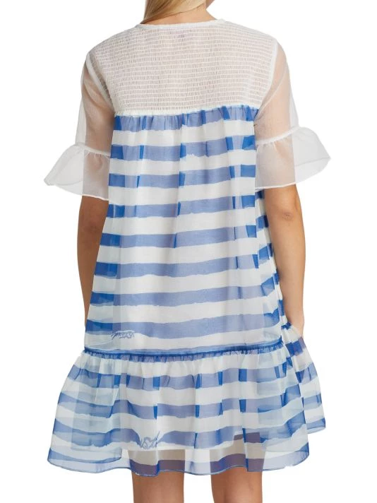 Chic shift dress with a bold striped body and framed with ruffle sleeves and hem.