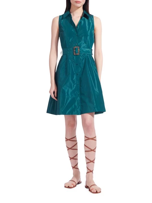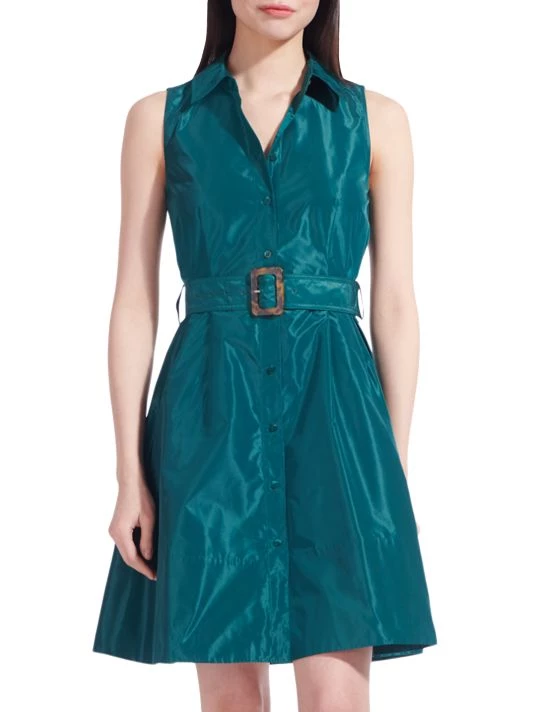 A glossy finish lends vibrancy to this fit-&-flare mini shirtdress, designed with a belt to define the waist.