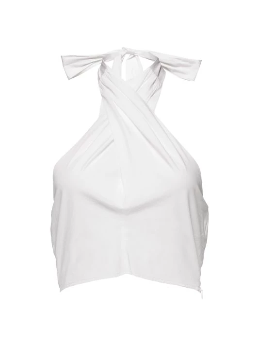 This stretch-cotton top has a crossover halter neckline finished with a bow at the nape of the neck.