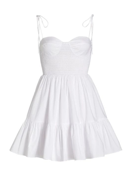 STAUD’s Landry minidress features a bustier-style smocked bodice with delicate tie-shoulder straps. A full A-line skirt with a gathered hem completes this sweet style.