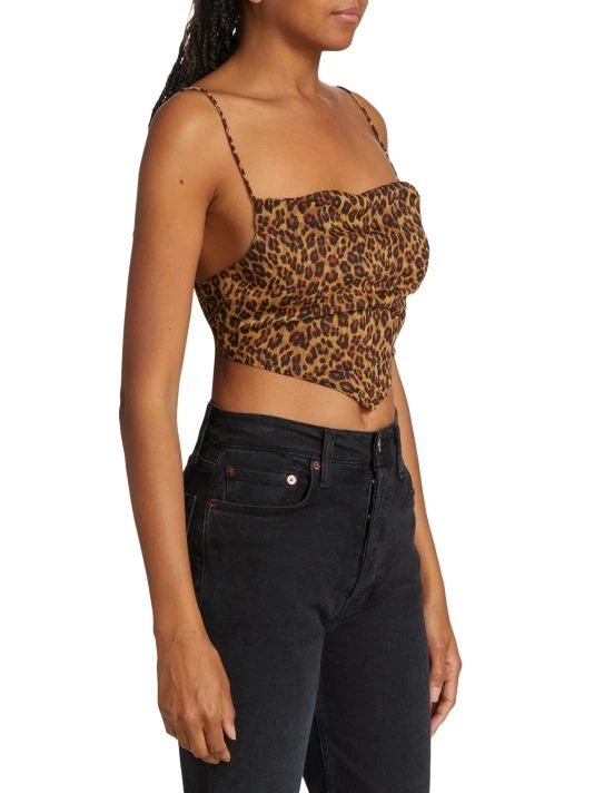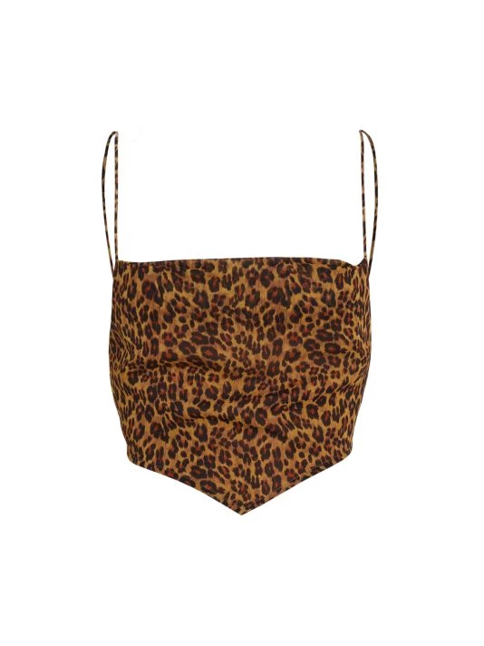 STAUD’s Leonie crop top showcases a playful leopard print, tied at the back creating a chic silhouette.