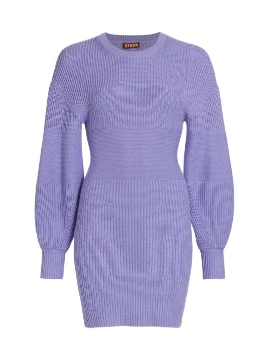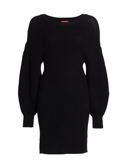 From STAUD, the Marylebone sweaterdress features drop shoulder balloon sleeves, a form-fitting silhouette, and a subtly contrasting stitched band around the waist and sleeves.