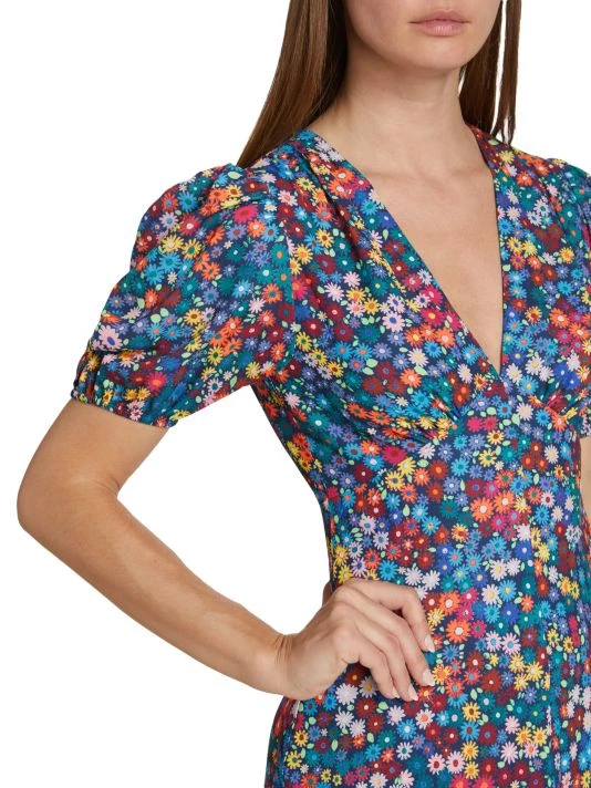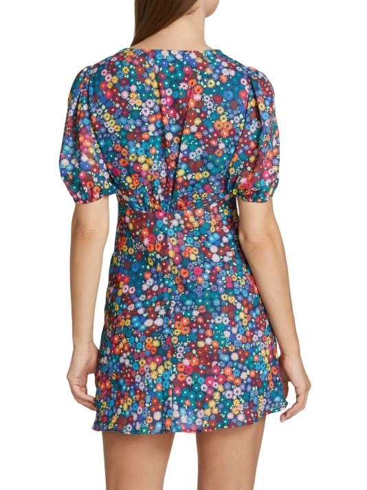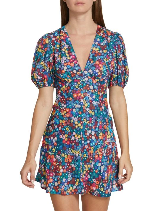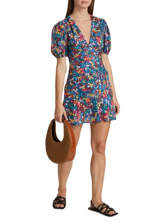 Crafted of crêpe de chine, STAUD’s Milla minidress returns with a new floral print. This signature style features a V-neck, empire-waist, and voluminous short puff sleeves.