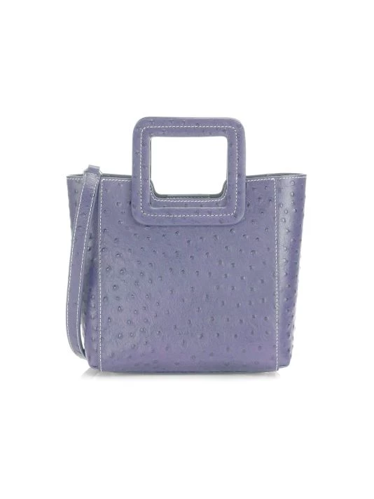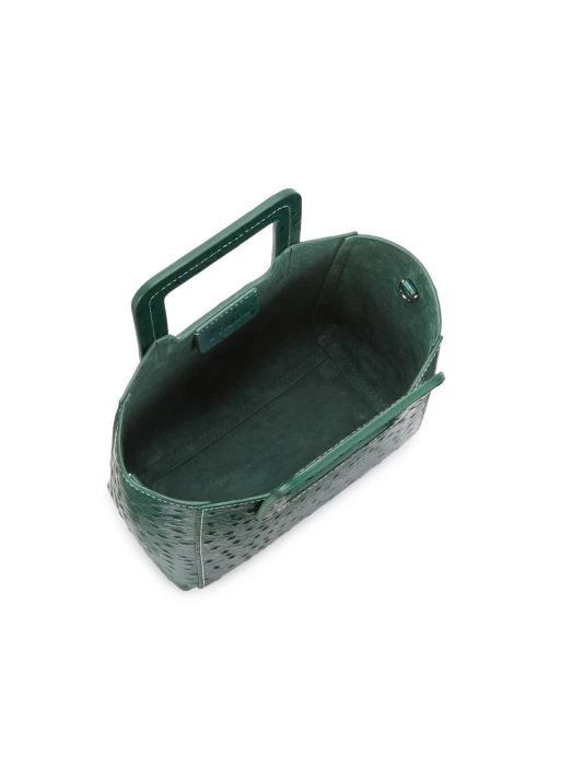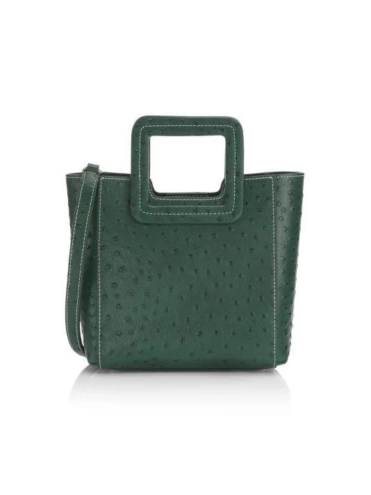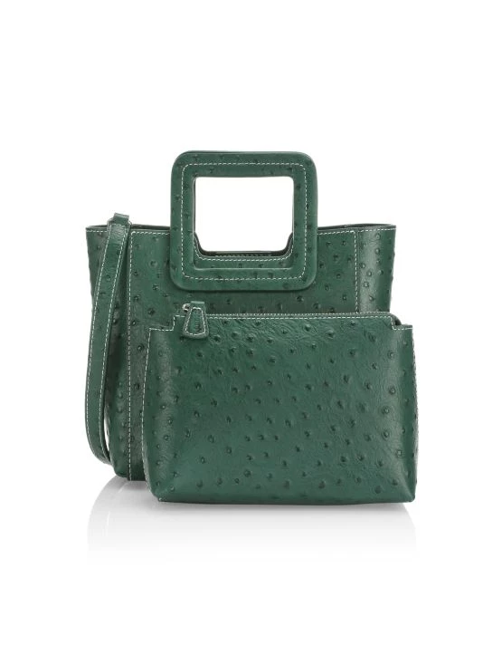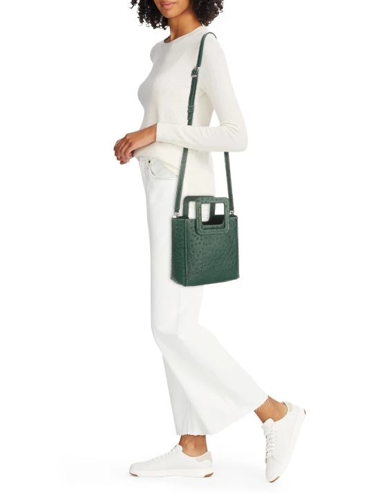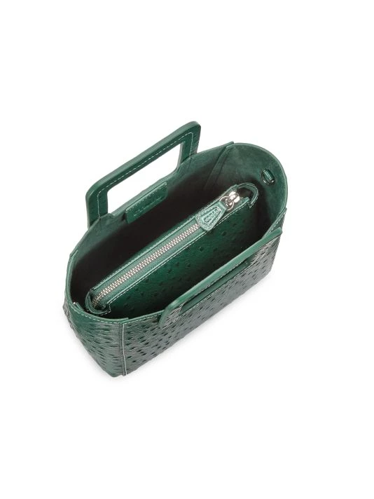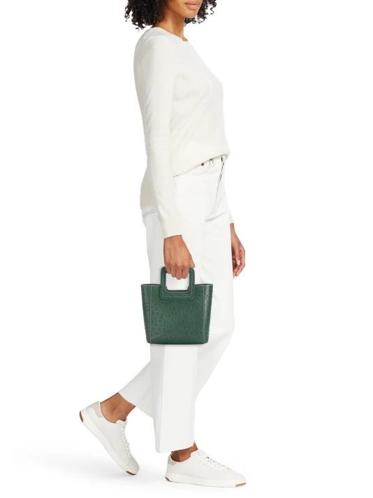Embrace the mini-bag trend with this petite version of Staud’s signature tote crafted of ostrich embossed leather with contrast stitching.