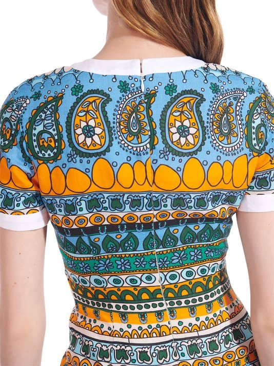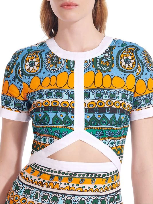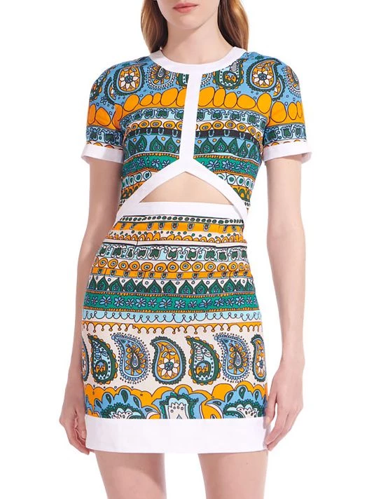 A daring waist cutout details STAUD’s Perla minidress. Decorated in an Ibiza Paisley print, this piece is contoured with striped panels.