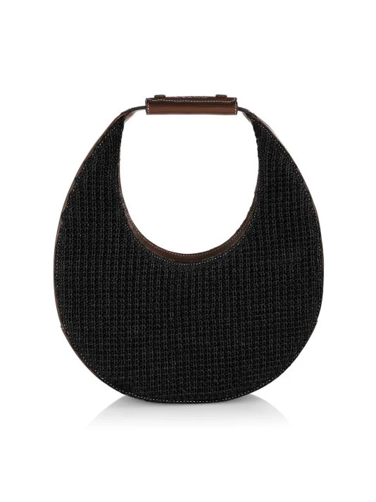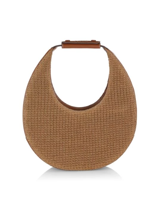 Flaunting a moon shape, this tote is crafted of woven raffia and rich leather.
