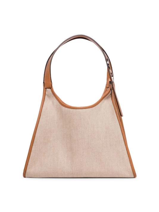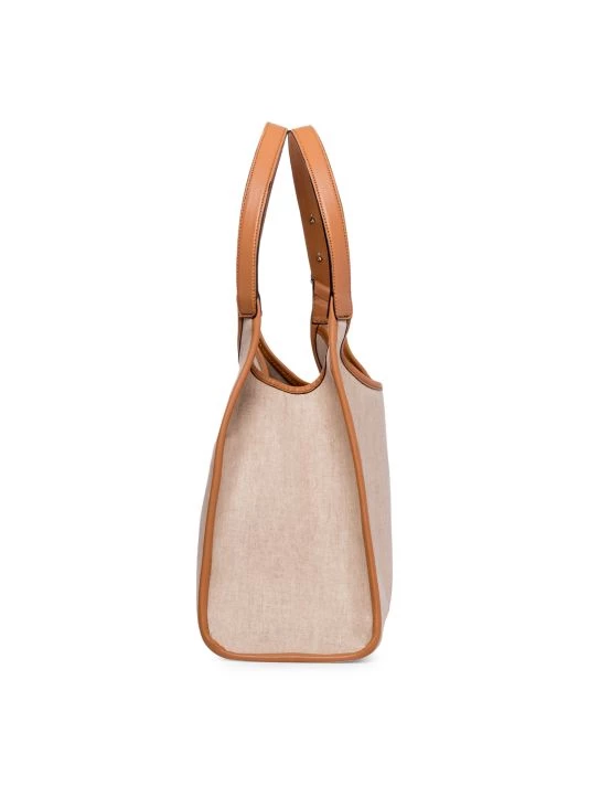This softly structured linen tote is edged with faux leather trim.