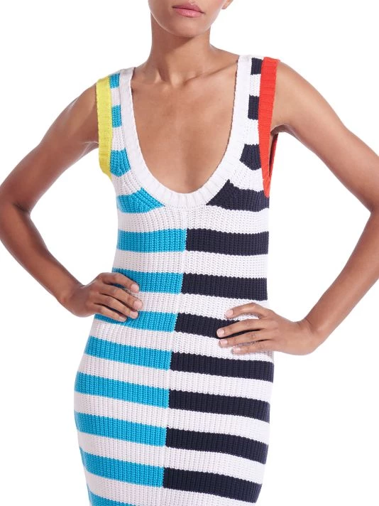 STAUD’s Seashore midi-dress is crafted of a soft cotton-blend knit, styled in a form-fitting silhouette. Adorned with vibrant colorblocked stripes, this design features a scoopneck and side slits.