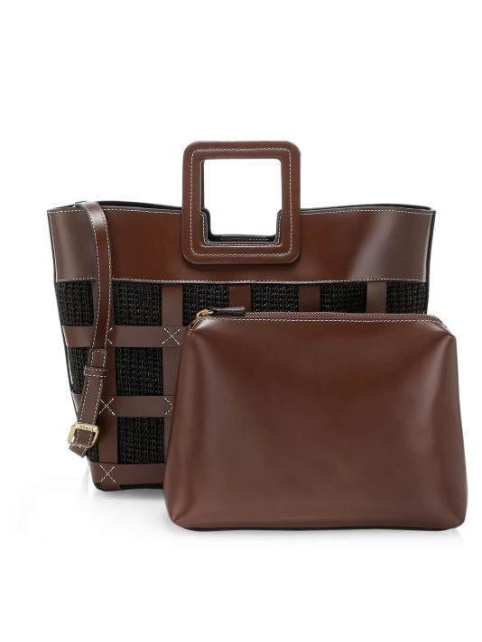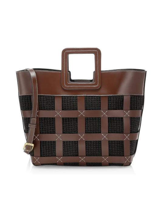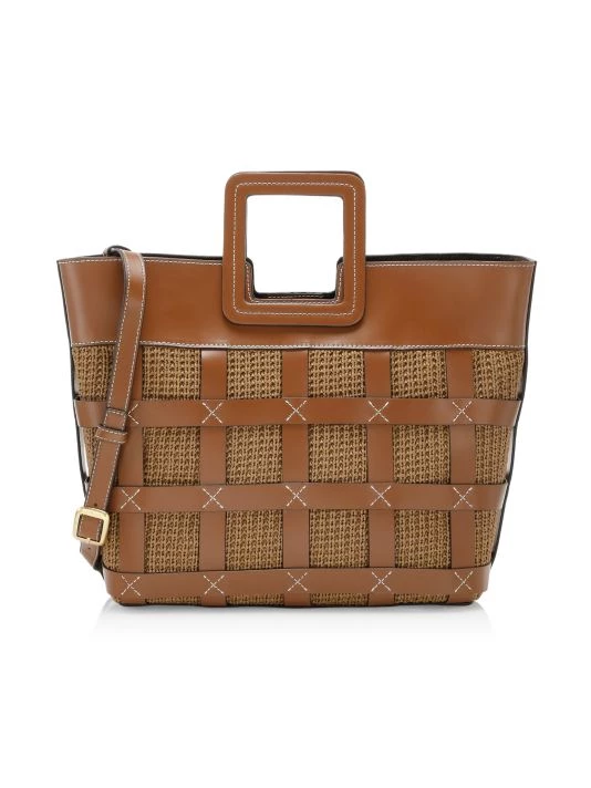 The Shirley is crafted of leather-caged raffia with contrast stitching and a removable shoulder strap.