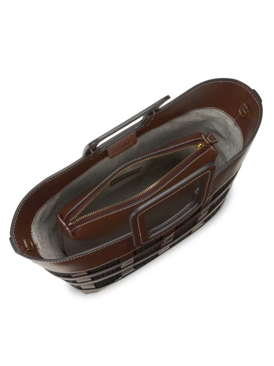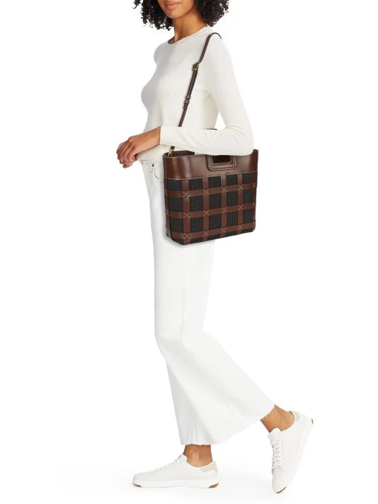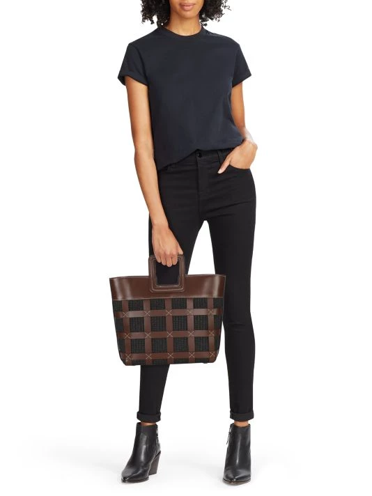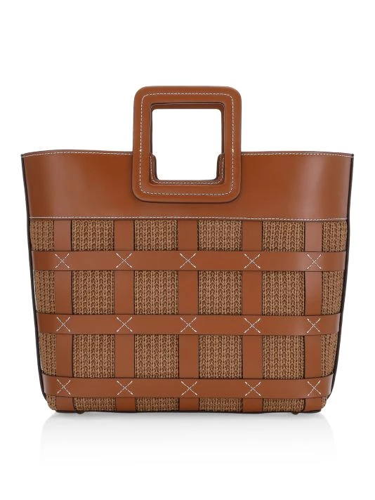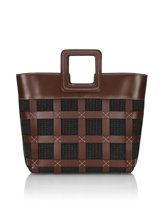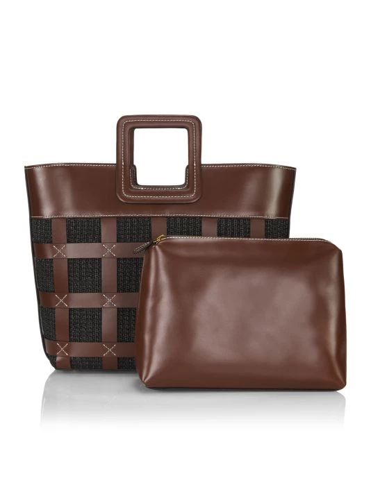 Topped with square cut-out handles, STAUD’s Shirley bag is crafted of caged leather with raffia inlays. This basket-style piece is accompanied by a removable zip pouch.