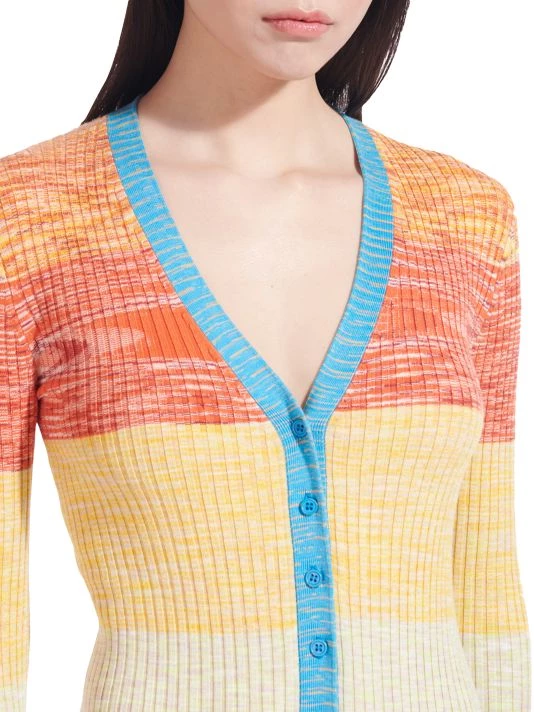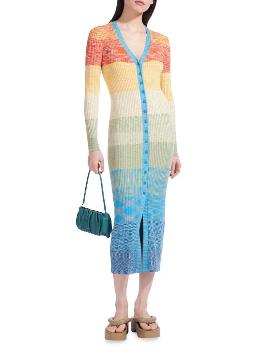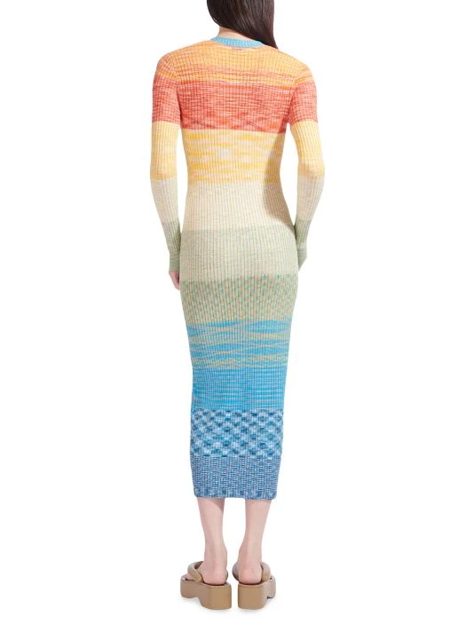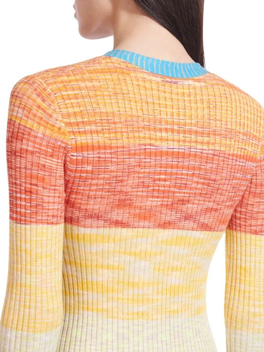 Designed with ombré coloring, this sweater dress is designed with ribbing for shape.