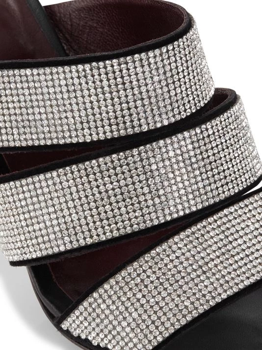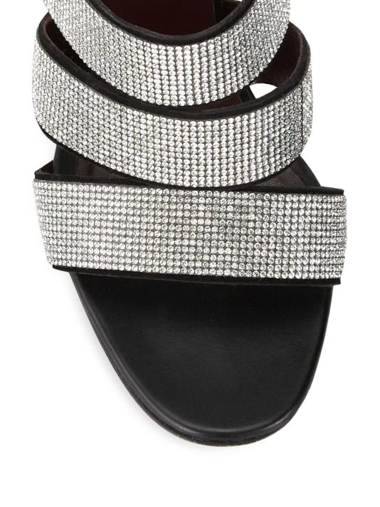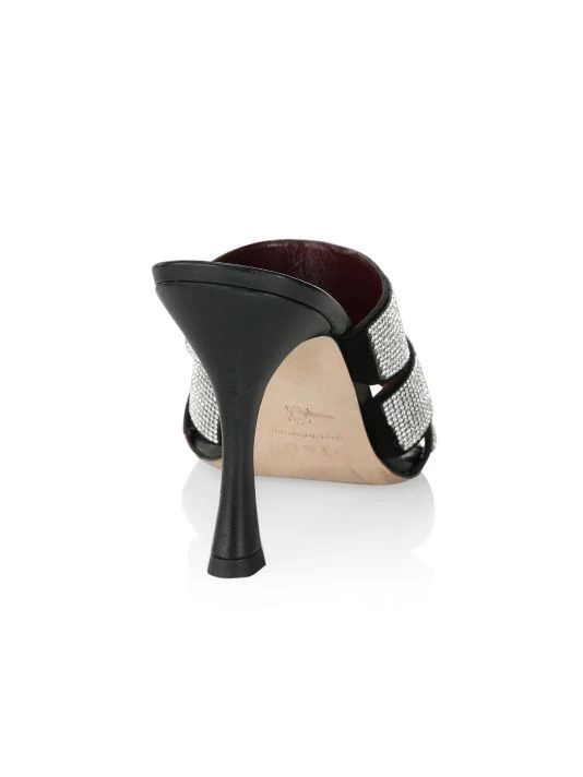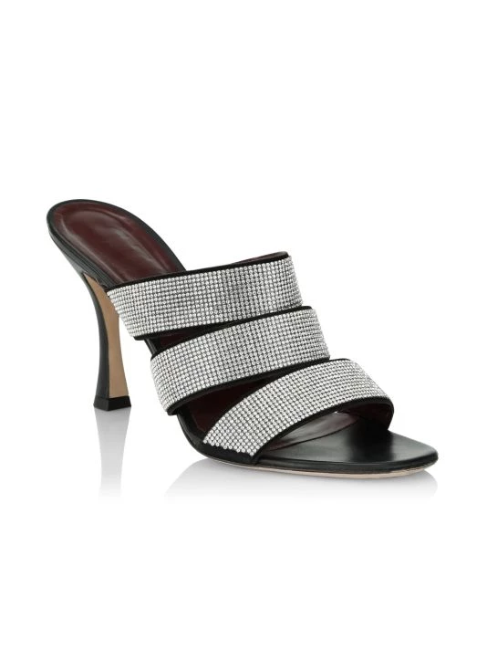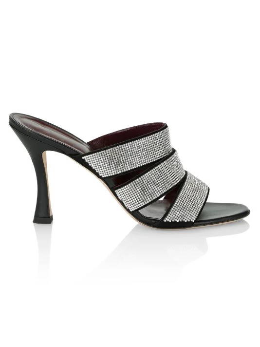Anchored by a flared heel, Staud’s Sonny sandals feature three rhinestone mesh embellished vamp straps.