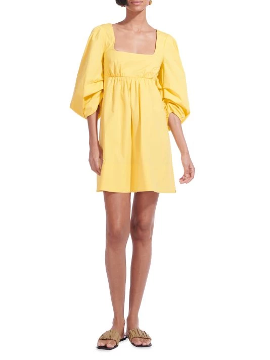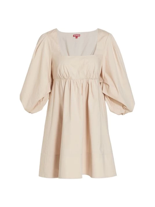 STAUD’s Sophie minidress boasts dramatic puff sleeves with a modern squareneck.