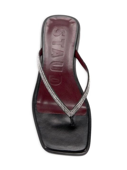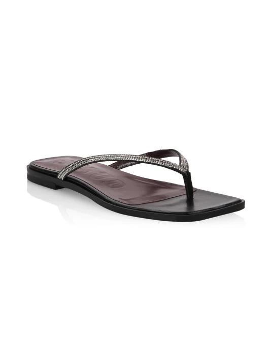 These square-toed thong sandals are crafted of smooth leather with rhinestone-embellished straps.