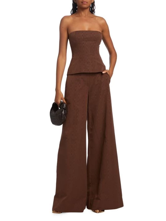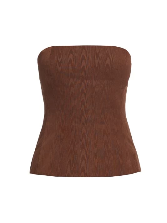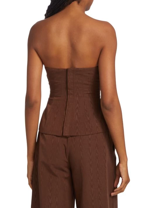 Flaunting a flattering bandeau neck, STAUD’s Woodgrain top boasts a textured wood design.